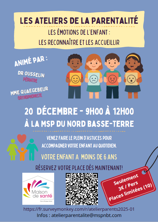 Une matinée consacrée aux émotions de l'enfant. Tu veux savoir comment aider les enfants à développer leurs habiletés émotionnelles ? Alors inscris-toi vite et RDV le 20 décembre prochain à la Maison de Santé Pluridisciplinaire du Lamentin ! 😉